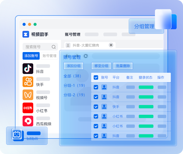 统一管理抖音、快手、视频号、小红书、西瓜视频和B站等多个主要内容创作平台的账号同时登录