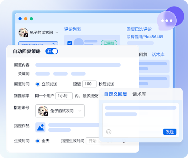 支持集中查看各个平台下作品的评论并进行批量处理回复,还可以设置自动回复规则